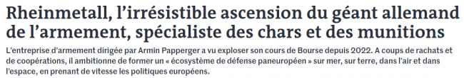 Rhein, c’est le Rhin, et Metall, c’est métal, comme celui des canons. Rheinmetall, c’est la nouvelle multinationale allemande qui veut tout écraser, en Europe.