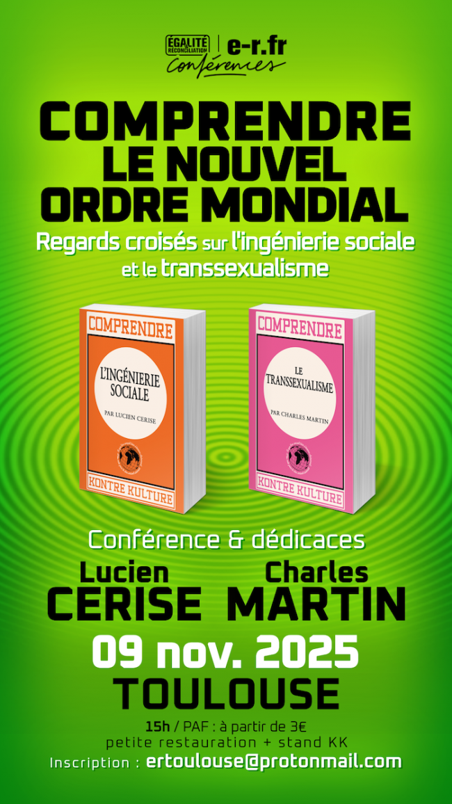 E&R Midi-Pyrénées recevra Charles Martin et Lucien Cerise à Toulouse le dimanche 9 novembre 2025 à 15 h pour une conférence intitulée « Comprendre le Nouvel Ordre mondial. Regards croisés sur l’ingénierie sociale et le transsexualisme ».