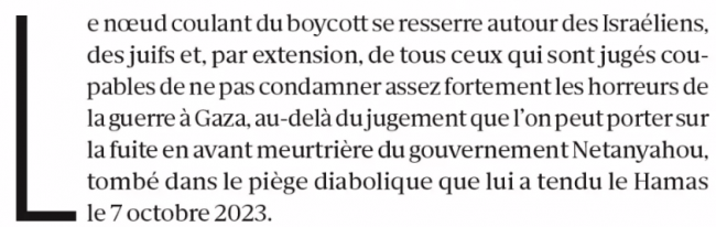 Premier paragraphe, et déjà une faute journalistique grave : le gouvernement Netanyahou serait tombé dans le piège du Hamas le 7 octobre 2023, alors que tous les gens sérieux savent désormais, et cela a été corroboré par des soldats et des officiers israéliens, que l’opération, prévue de longue date, a été suivie de près par les services israéliens. Le relâchement de la surveillance de la frontière le 7 octobre au matin a fait le reste. Quand on dirige un canard, on n’a pas le droit de se tromper de la sorte, et de tromper son lectorat. Ou alors on est malhonnête. On en revient toujours au même choix : médiocrité ou malhonnêteté.