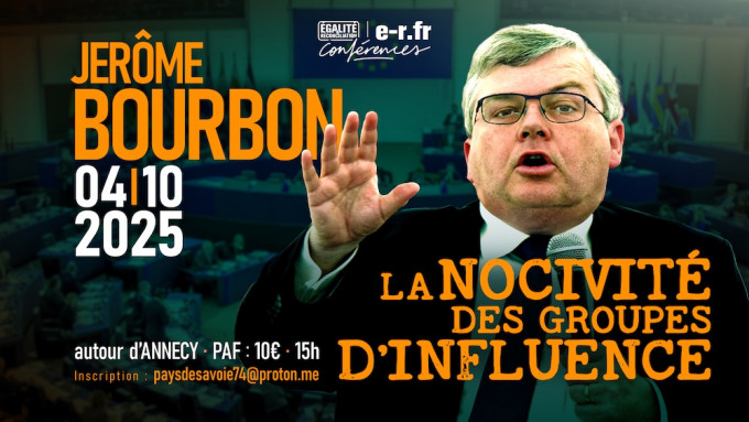 E&R Pays-de-Savoie recevra Jérôme Bourbon près d’Annecy le samedi 4 octobre 2025 à 15 h pour une conférence intitulée « La nocivité des groupes d’influence ».