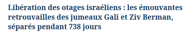 Le Figaro focalise sur les frères Beman, tandis que France Info passe la parole à Paloméros, bien connu des chasseurs de gamelins. Il va tenir le crachoir pendant un quart d’heure sans rien dire, sinon en enfilant les banalités israélistes, alors qu’on est quand même sur un génocide.