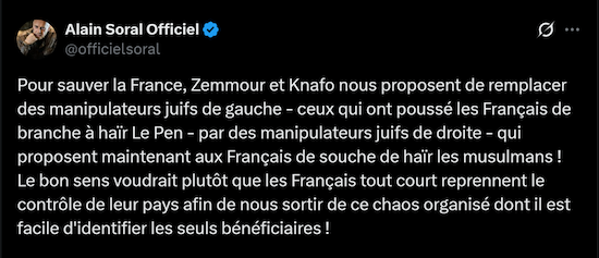 Merci Moshé !— Alain Soral Officiel (@officielsoral) October 3, 2025